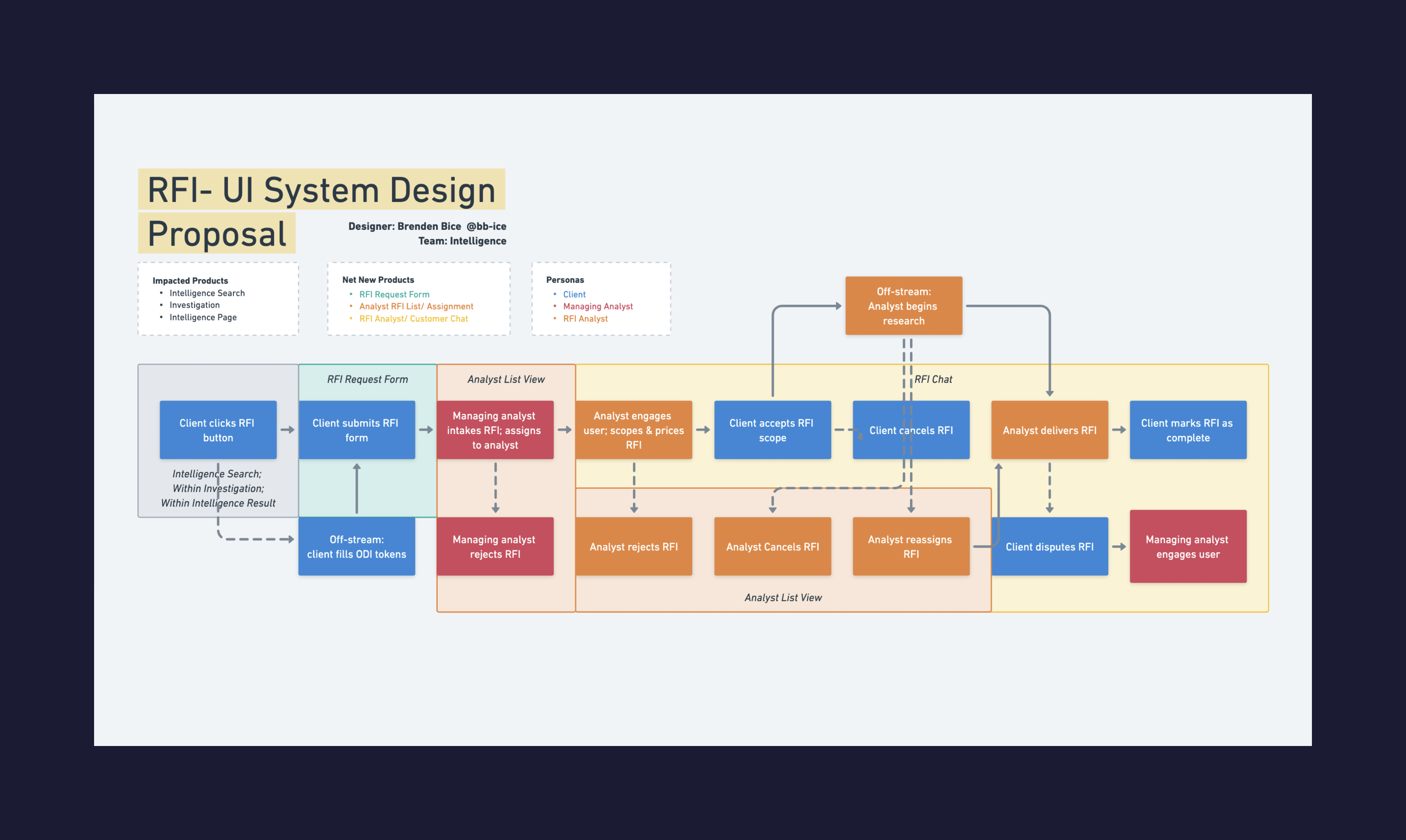 Key Insight The entire process could be kept online for the client, at the point of discovery of information that could lead to an RFI. The product manager and I used this research to capture the nuances of 3 different personas: client; staff analyst; managing analyst.