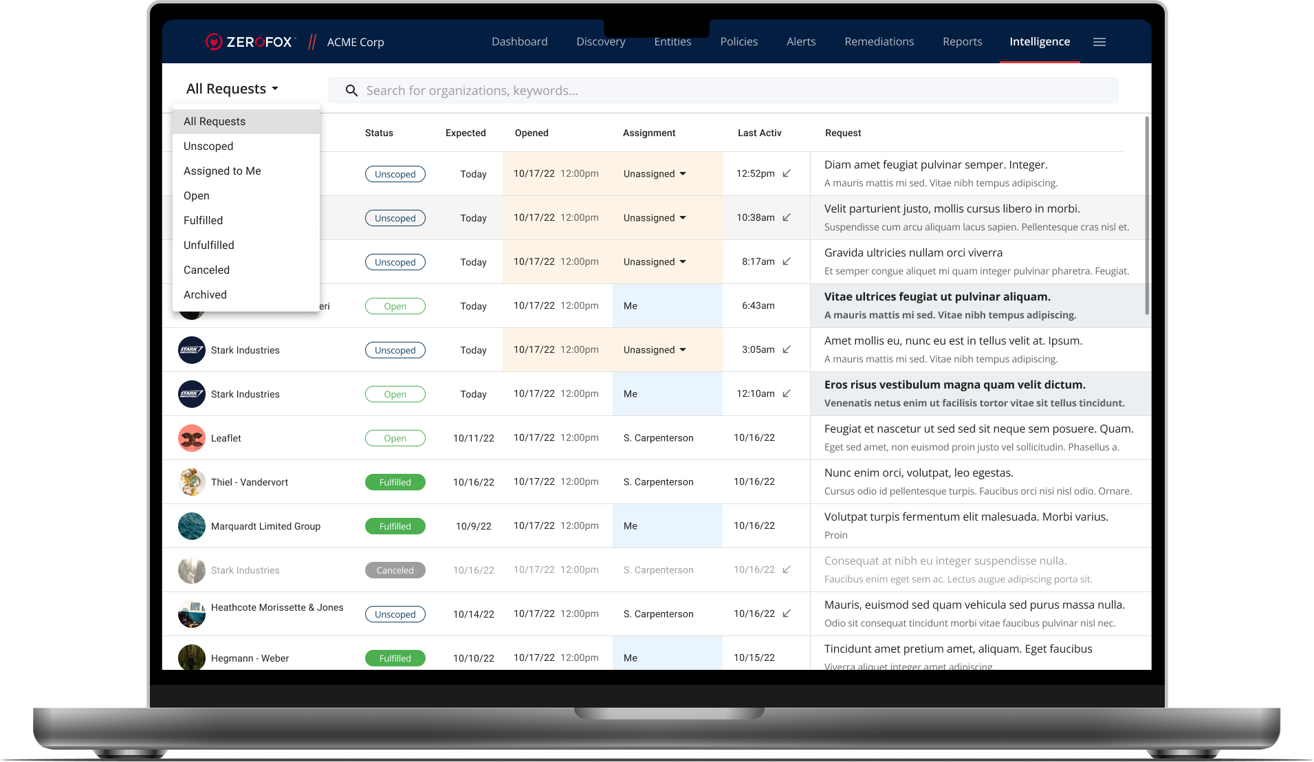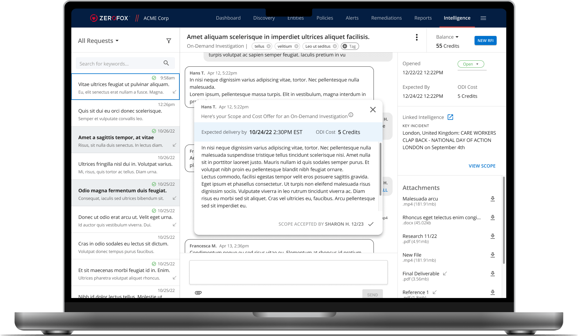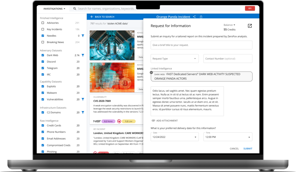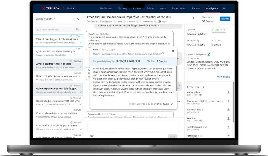 Clients can submit a further Request for Intelligence on a specific attack or threat. ZeroFox analysts respond to the inquiry with intelligence from selected sources and methods. Prior to these new features, this was all communicated and delivered via email.